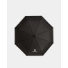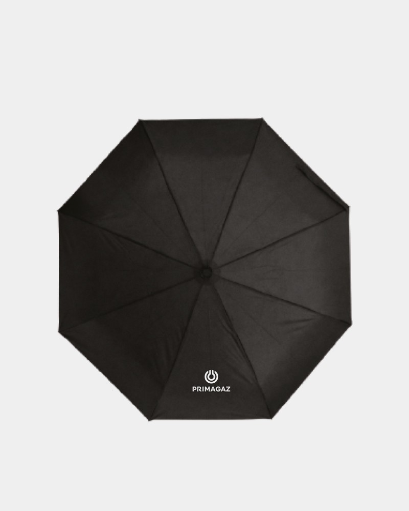 Parapluie pliable de 21'', attributs en pongé 190T RPET, mât et baleines en métal plaqué noir et manche en bois.